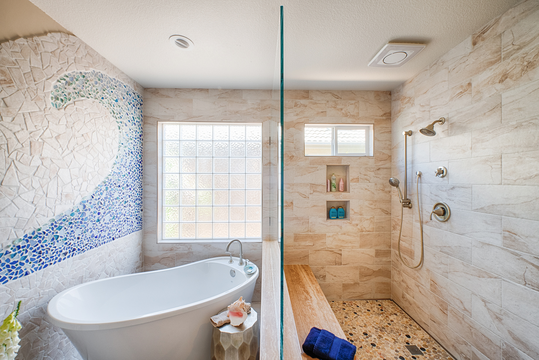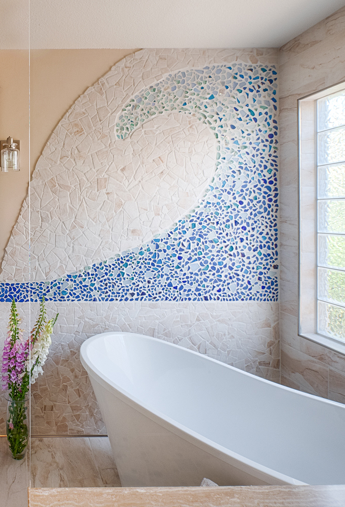 The client came to me at our very first meeting with a concept photo she had found online of a tiled bathroom that had a similar wave. You could almost say that the entire home was designed around this single design element. It might have felt very out of place in this central California home if we had not carried the colors, textures, and beach elements throughout, including the painted surfboard in the entry, and the custom painted wood plank in the dining area featuring a beach scene of the client with her dear friend and surfing partner. There were some challenges in creating the wave, but the extra effort paid off. Hundreds of pieces of beach glassware were sorted and cleaned, and small pieces of treasured abalone shell were added in the end to create extra sparkle from the natural light coming through the adjacent window.